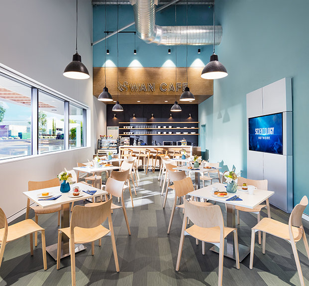 Le café offre un lieu de réunion pour ceux qui participent à des activités, comme pour les paroissiens pendant les pauses dans leurs services de Scientology.