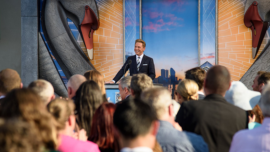 Alors qu’il dirigeait la cérémonie d’inauguration, David Miscavige a parlé du nouveau futur qu’est la Scientology pour l’Australie-Occidentale. « Et avec cela, nous sortons de ce moment idyllique pour réaliser le dernier rêve avant que ce ruban ne tombe... Ce qui revient à dire que c’est maintenant le moment d’offrir notre aide inconditionnelle et sans distinction. Ce n’est que de cette façon, que cette nouvelle Église de Scientology servira Perth et deviendra Perth. »