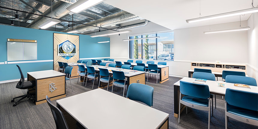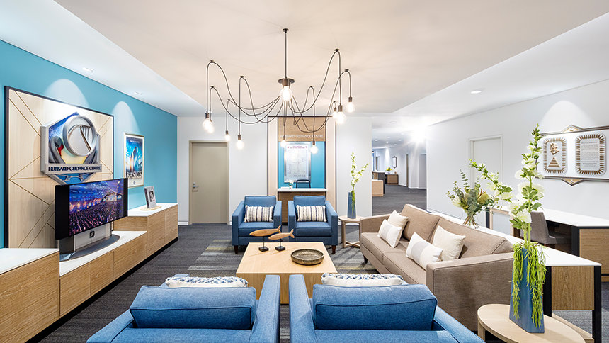 Tous ceux approchant la nouvelle Église de Scientology de Perth sont accueillis par sa façade impressionnante. En tant que paroissiens ils entrent dans le grand espace et sont accueillis à la réception avec vue sur le centre d’information public. L’espace est ouvert avec de hauts plafonds et les éclairages de type industriel. Des lignes propres, le métal sombre et le bois chaud et rustique donnent un côté industriel moderne que vous pouvez sentir dans tout l’espace.