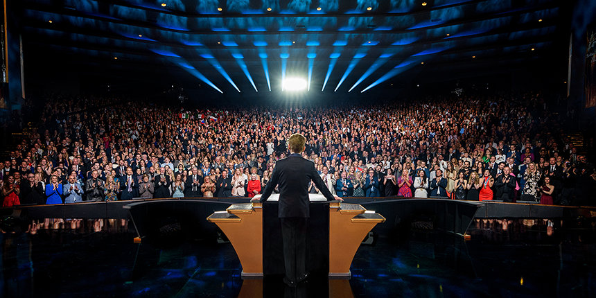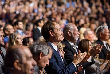 Quand la foule a repris son souffle quelques minutes plus tard, la soirée s’est achevée sur une note finale éclatante alors que Monsieur Miscavige prononçait un message d’anniversaire déterminant de Monsieur Hubbard :